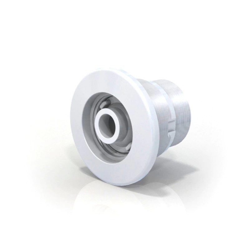 Retorno orientable para piscinas de fibra de vidrio, con aro desmontable blanco, cuerpo con rosca hembra de 1 1/2", y boquilla esférica con pico de Ø 19mm. Instalados por debajo del nivel de agua, han sido diseñados para producir flujo en dirección al skimmer o toma de fondo, y así favorecer al filtrado y limpieza de la pileta.